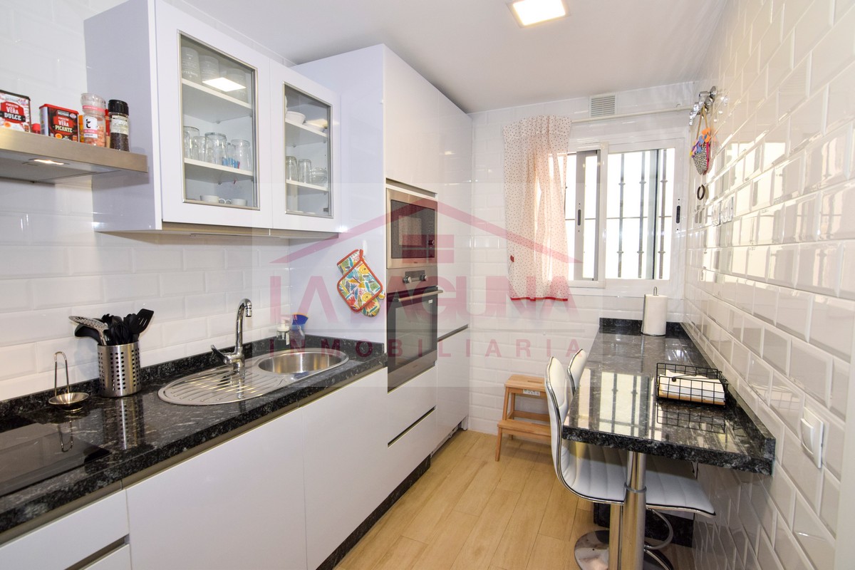 Piso en planta baja con tres dormitorios y dos cuartos de baño, uno de ellos dentro del dormitorio principal, cocina independiente que tiene incorporado el lavavajillas. Amplio salón-comedor con salida directa a la terraza con jardín. Tiene aire acondicionado centralizado. Plaza de garaje subterráneo. El residencial dispone de piscina comunitaria y pista de pádel. MASCOTAS NO. A 10 minutos andando a la playa.